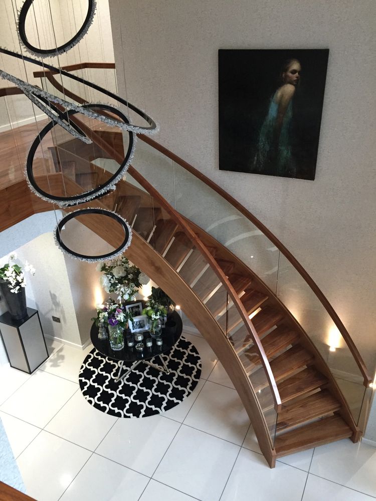 And here's one I designed for a famous England International Footballer, in Prime Grade Walnut with curved glass and continuous Walnut Handrails.